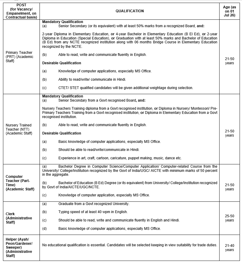 AF School Tambaram invites applications from eligible and desirous candidates for the vacancy/ empanelment of Primary Teacher (PRT), Nursery Trained Teacher (NTT), Computer Teacher (Part-Time), Clerk and Helper at Air Force School Tambaram on a contractual basis for the AY 2026-27 (01 Apr 2026 to 29 Mar 2027). Interested candidates should take print-out of the Bio-data form uploaded on the AF School website www.airforceschooltambaram.in [under the tab Selection and Empanelment in Air Force School, Tambaram (Non-Government Organisation)']. Relevant QRs are also uploaded on the ibid website of AF School. The duly completed forms along with recent photographs (pasted in the filled-in application-cum-form), attested copies of educational qualifications, desirable qualifications if any and relevant experience certificates should be submitted in a single copy (in hard) to Air Force School Tambaram C/O AF Stn Tambaram, at the earliest or latest by 03 Jan 2026. For outstation or remote candidates or any candidate if so desired, the duly completed applications as cited above can be sent via post (ordinary or speed post) to AF School on the address "Executive Director, Air Force School Tambaram, C/o Air Force Station Tambaram, Chennai-600046) so as to reach before or by the last date of submission of applications, ie. 03 Jan 26.